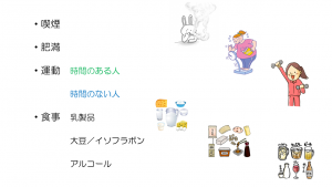 まず、生活習慣と乳がんとの関連について、喫煙・肥満・身体活動が重要な因子であることが示されました。喫煙は、乳がんの再発や死亡リスクを高める可能性が高く、診断後も喫煙を続けた場合にはリスク上昇がほぼ確実とされています。一方、診断後に禁煙した場合は、そのリスクが低下することが報告されており、術後に最も優先すべき生活習慣の改善として「禁煙」が挙げられました。