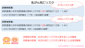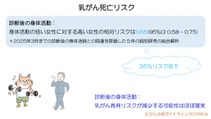 体重管理については、痩せすぎ・肥満のいずれも望ましくないことが強調されました。診断時・診断後ともに肥満は乳がんの再発および死亡リスクを上昇させることが、複数の研究の統合解析から示されています。また、急激な体重減少や大きな体重変動も予後を悪化させる可能性があるため、標準体重を目安に安定した体重を維持することが重要と説明されました。