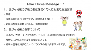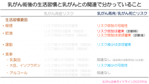 一方、サプリメントの高用量摂取については安全性が確立していないため、控えるべきとされました。アルコールについては、適量であれば乳がん予後への悪影響は少ないとされるものの、体調や体質を踏まえた節度ある判断が必要と説明されました。